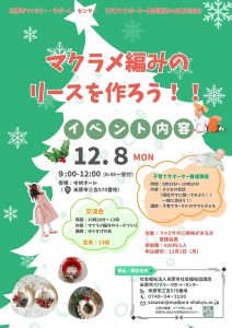 【日時】令和7年12月8日(月)9時~12時 【場所】ゆめホール 住所:米原市三吉570番地 【内容】(養成講座)子ども世話 講師:子育てサークルMANIMANI (交流会)マクラメ編みのリース作り 講師:ゆうすげの会 【対象者】ファミサポに興味がある方 ファミサポ登録会員 【参加費】500円/1人 【定員】15組 【問合せ先】米原市社会福祉協議会 米原市ファミリー・サポート・センター 電話:0749-54-3100 FAX:0749-54-3115 LINE:添付チラシの2次元コードからも申し込めます メール:sasaeai@maibara-shakyo.or.jp
